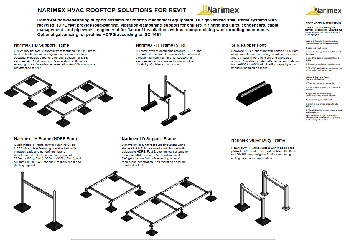 פתרונות נרימקס לREVIT (רוויט) הם כלי עזר יעיל וקל לתכנון תמיכות מודולריות וידידותיות לגג ולמבנה עבור מערכות אלקטרו מאכניות (M&E) כגון מעבים, יטאות, צילרים, צנרת, חשמל ועוד.